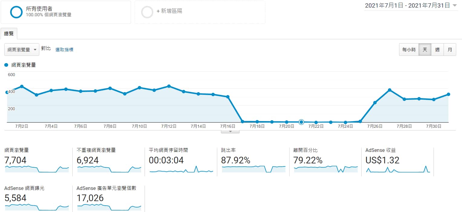 2021年7月紀錄|GA設定跑掉啦!月流量降到7千多
