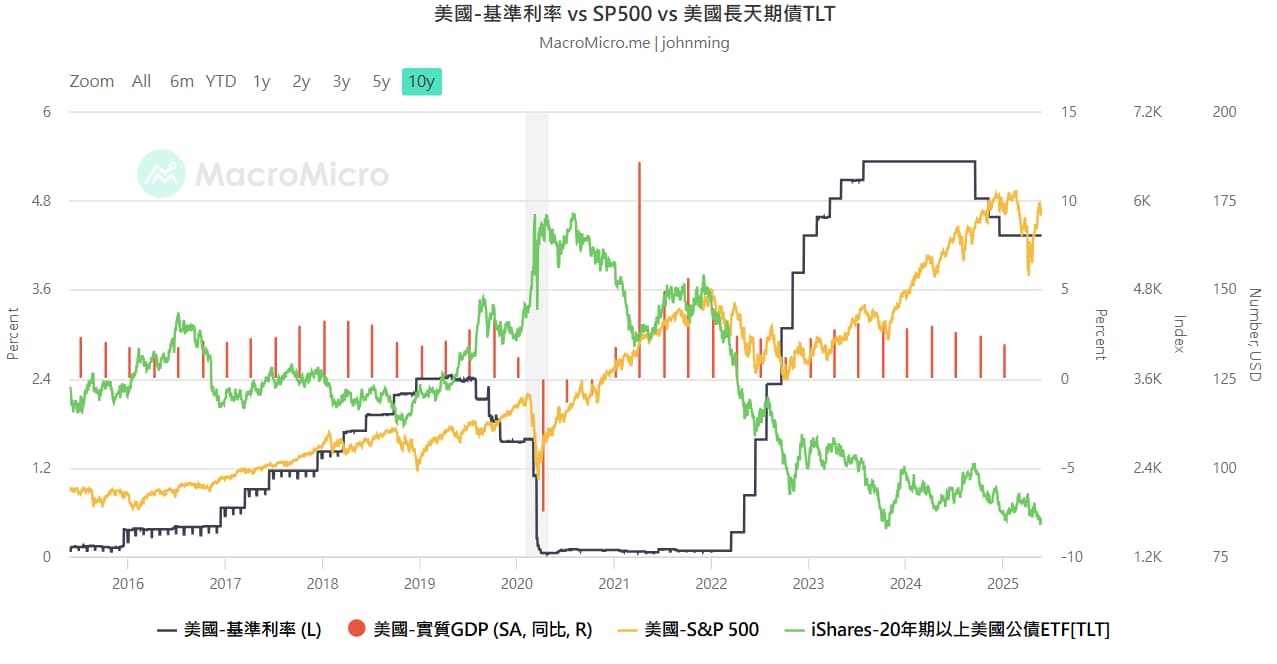 而股市呢?就一路的創新高,不過在2022年開始進入升息循環時,有小跌一下,但沒美債慘。