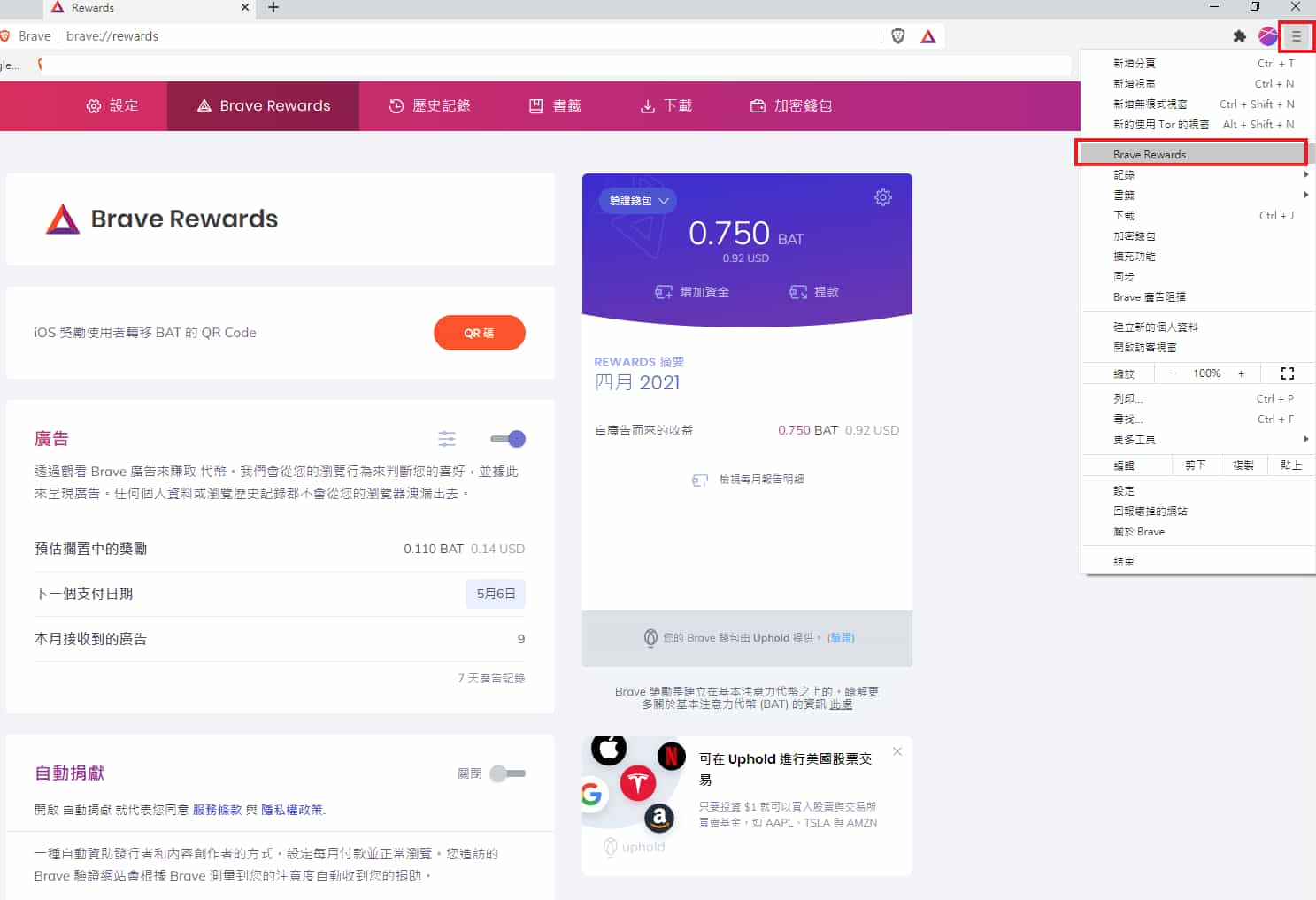 1.點開Brave瀏覽器→右上角的≡→點Brave Rewards→會跑出如下畫面