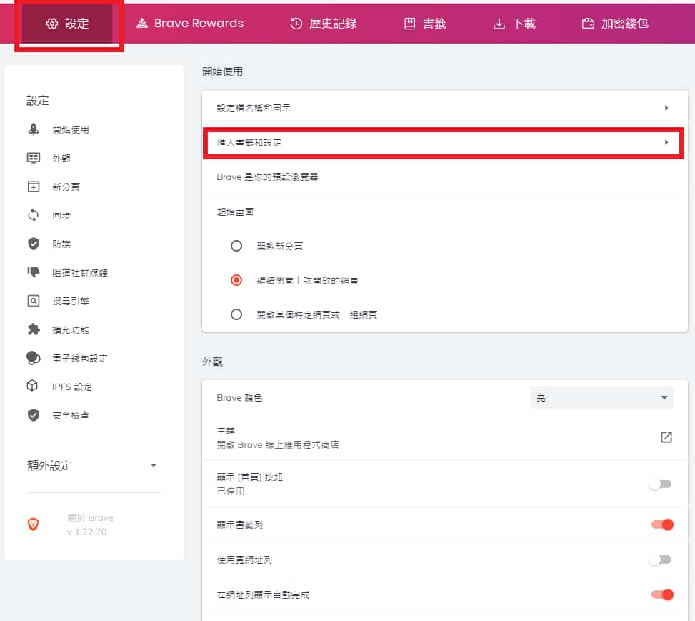 3.上方選單選擇最左邊的設定,然後有個選項"匯入書籤和設定",這裡可以選擇由你的Chorme或HTML格式化檔案等匯入書籤到這個瀏覽器。