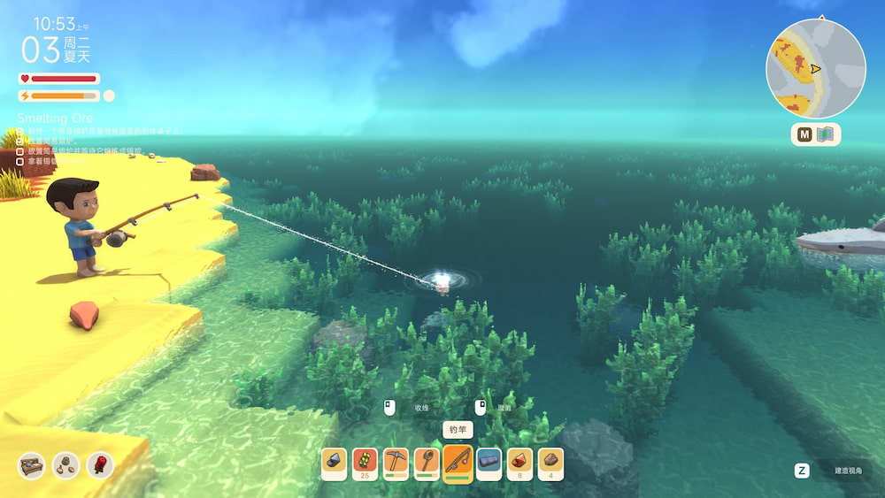 釣魚是從頭到尾最好賺錢的方式,買到釣竿之後,可以到附近的地方釣魚,左鍵按住越久、拋的距離越遠。