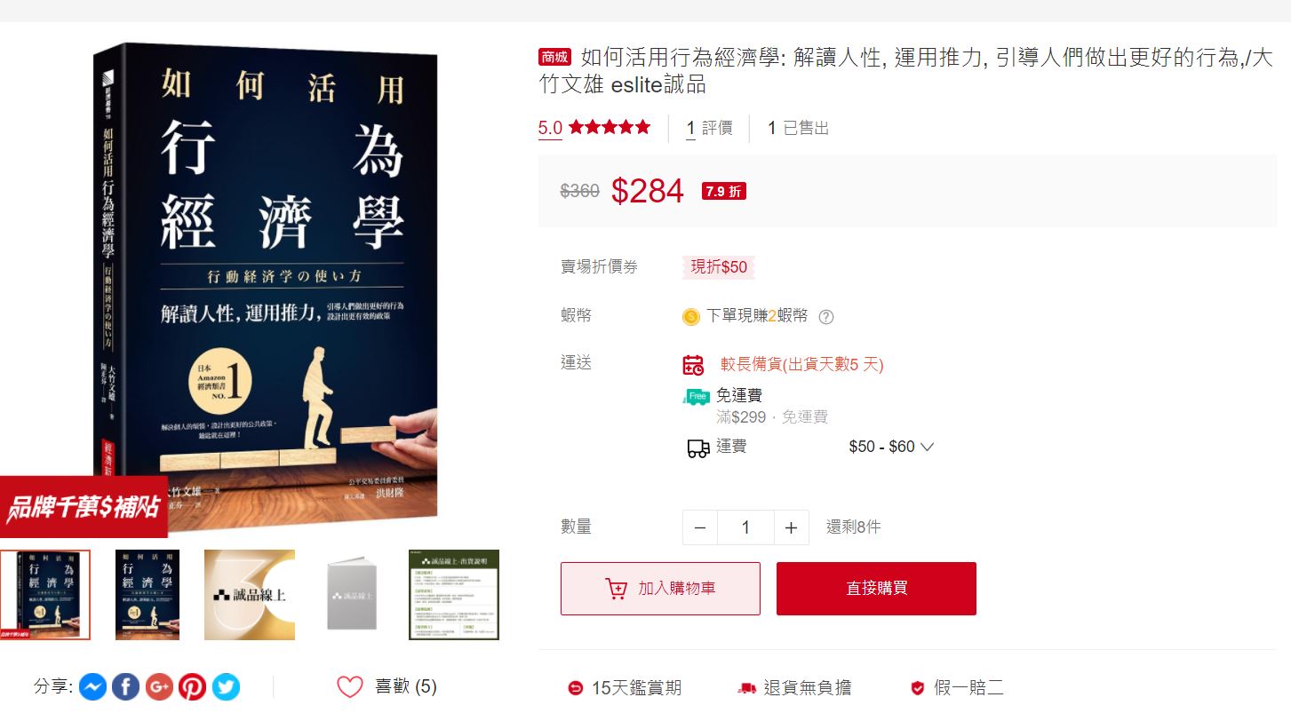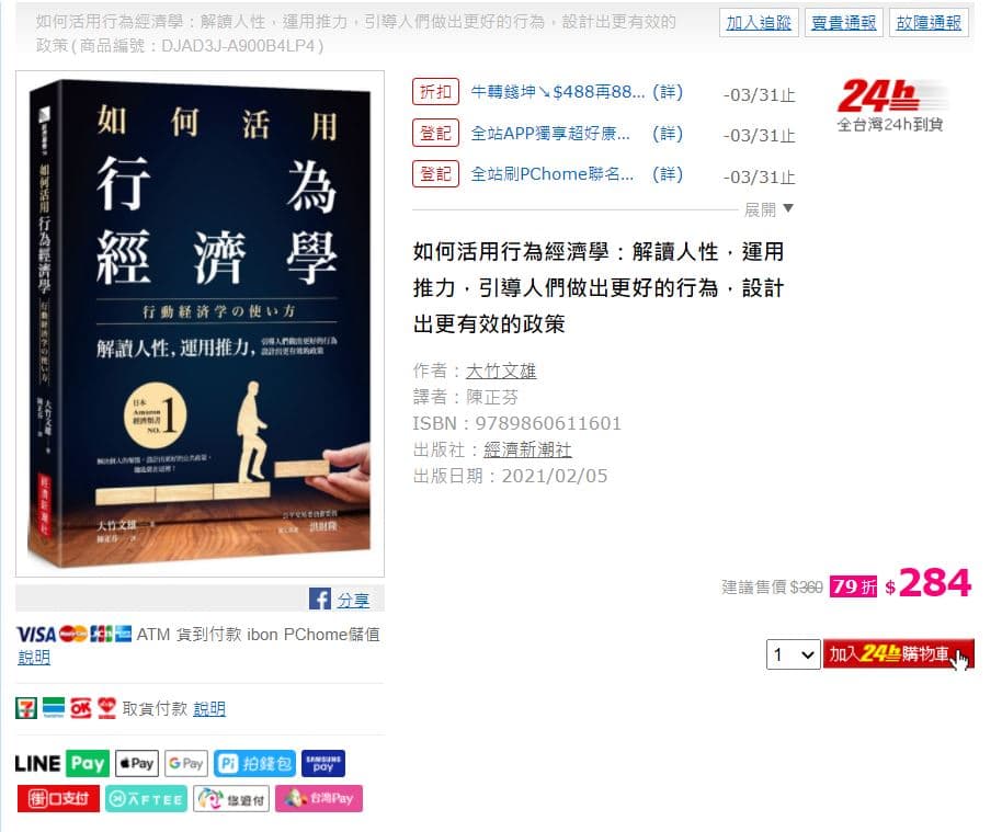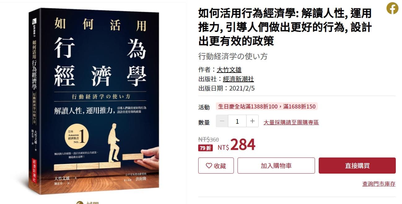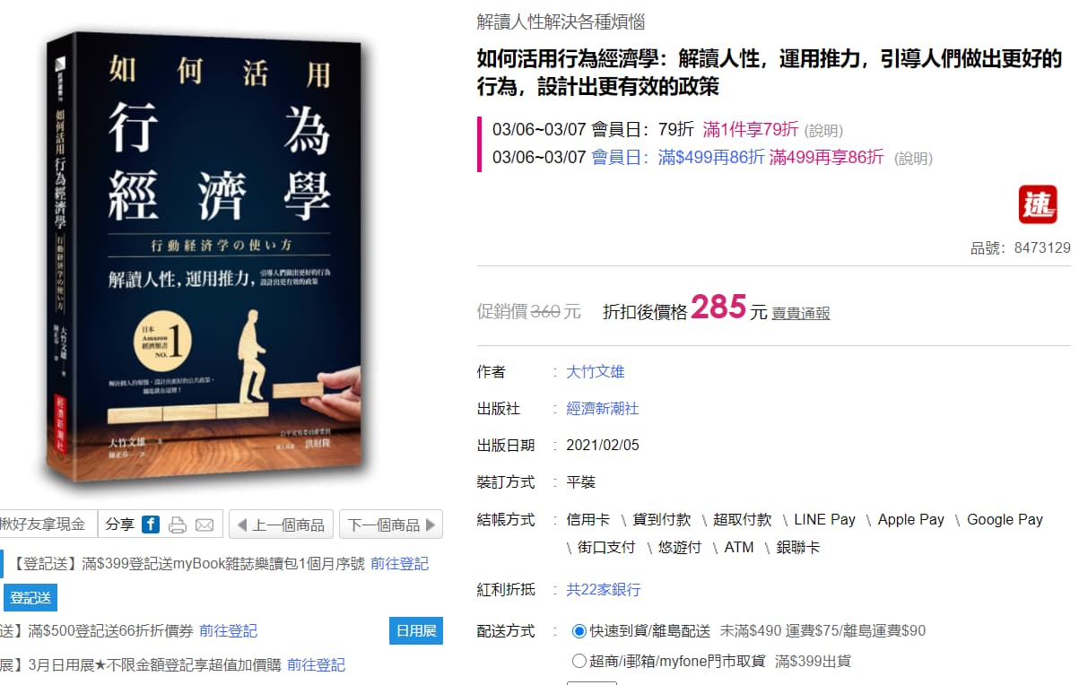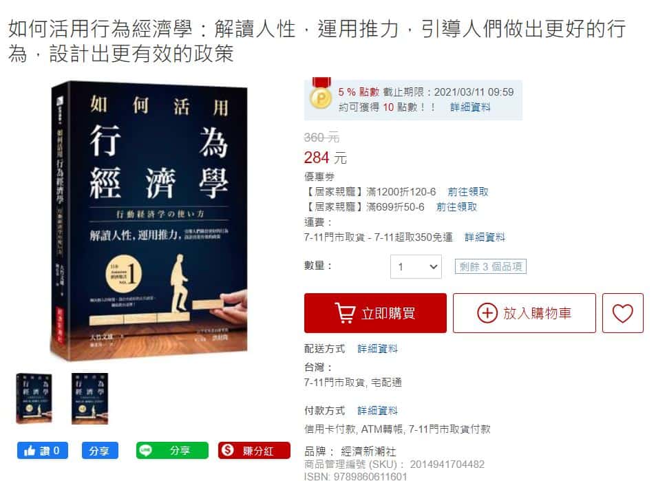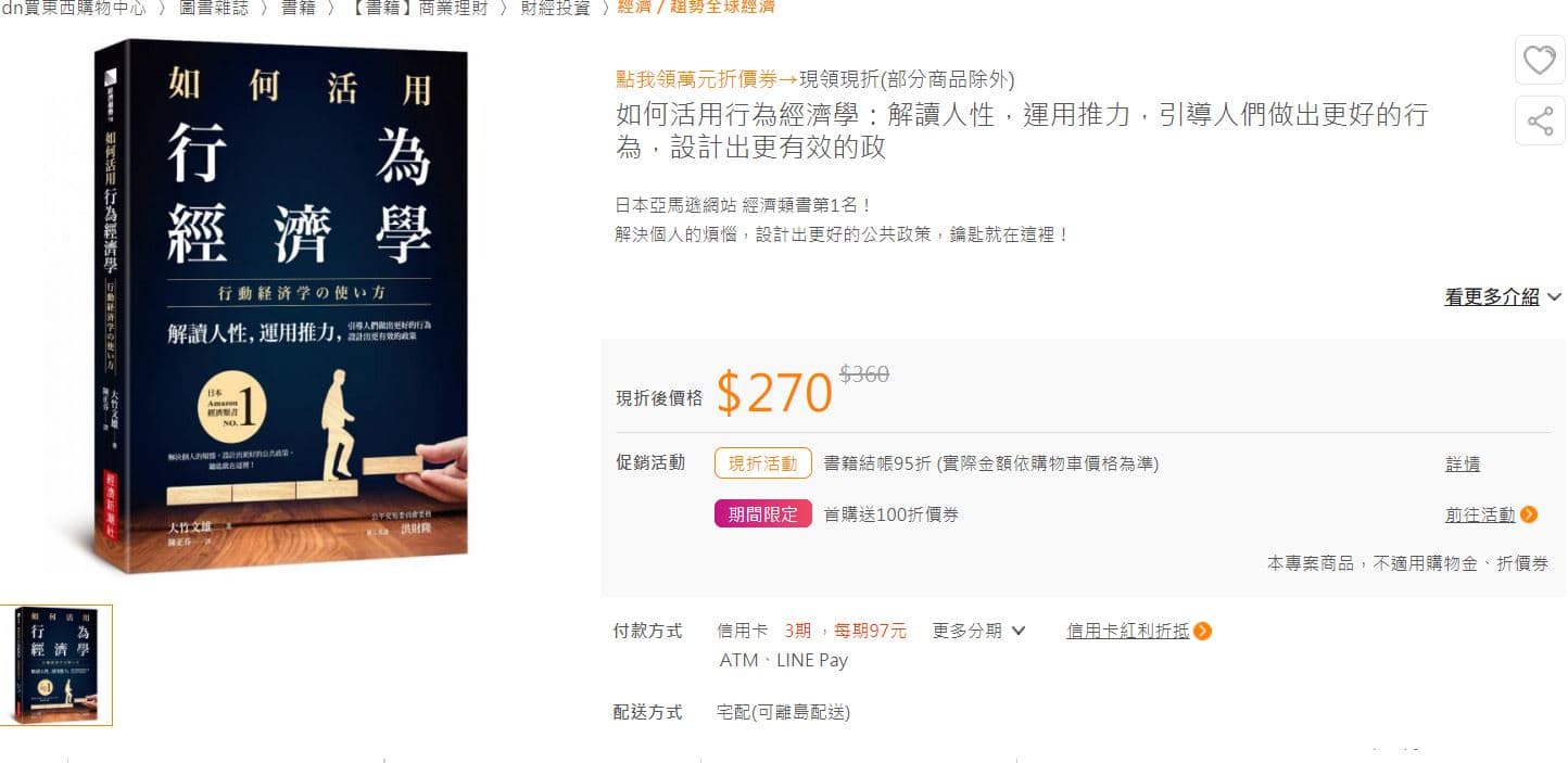 | 購物平台 | 購買行為經濟學紙本書價格 | 額外優惠 |