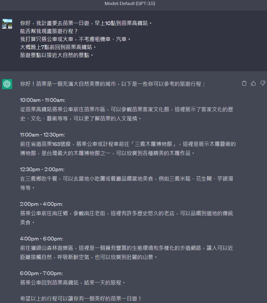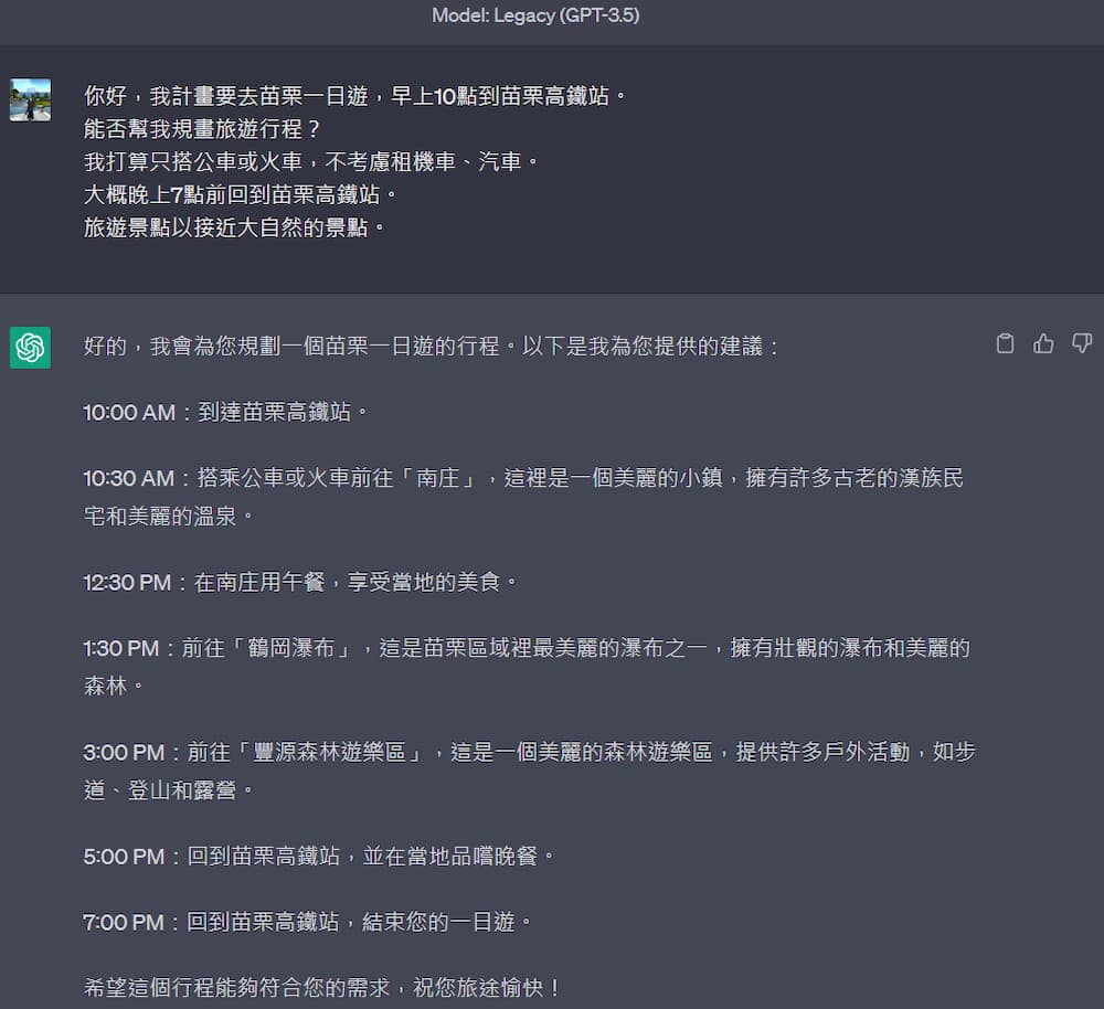 快速版的GPT-3.5稍微比較可信點,有標註時間範圍,但可惜的是公車號碼沒有寫,不過有一點值得注意的是,下午4點到6點的獅頭山森林遊樂區是在山上,我是傍晚才去那裏有點奇怪啦,這個景點應該是白天去比較好吧!