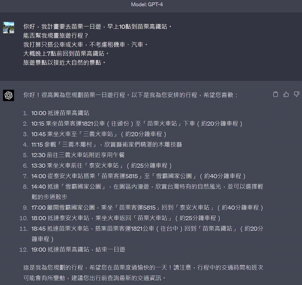 首先是免費版的GPT,只有標示出一個時間點,然後做什麼事情,但是沒有給出公車號碼,這樣子很難判斷到底是幾點要去搭公車,而且搭公車會花多久時間?待在景點會玩多久?
