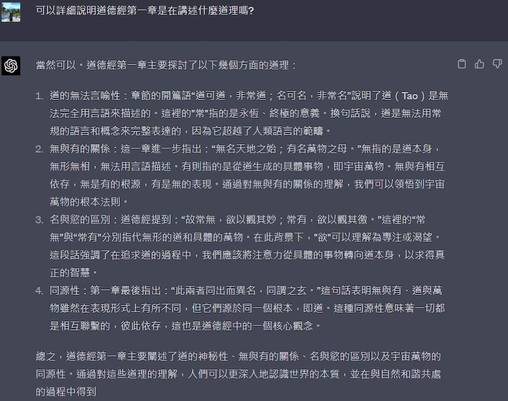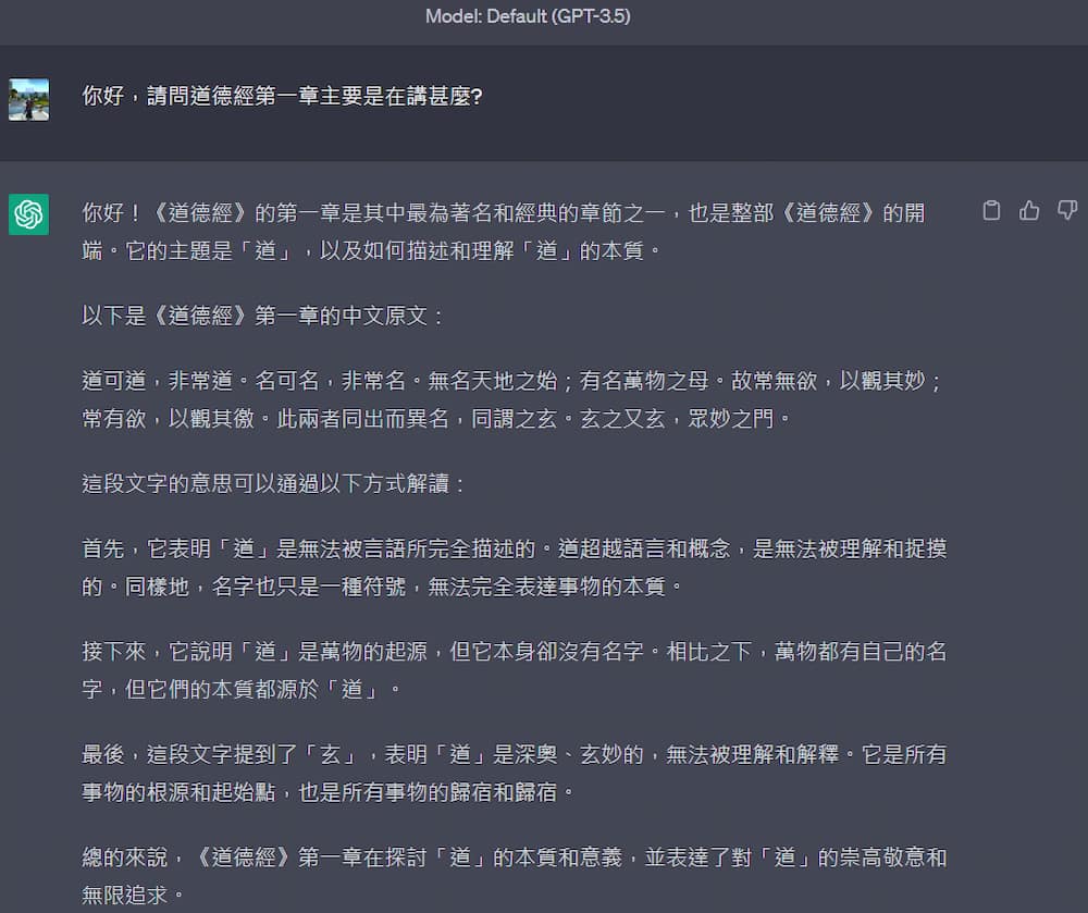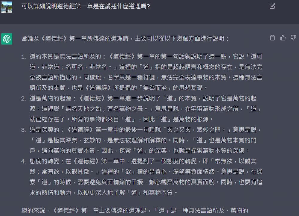 先問簡單的問題:「道德經第一章在說什麼?」以及追加提問「詳細說明」