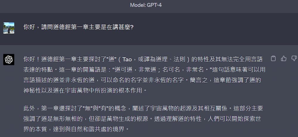有上述回答可以看出,免費版GPT-3.5回復的訊息比較少、且內容比較沒那麼深入(只有圍繞在"道"的解釋),而且比較多贅字。