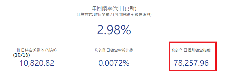 目前我大概有9400~9500個MAX幣,有一半的數量已經鎖倉超過半年(時間加權+80%),另一半則三個月以上(時間加權+50%),每天獲得的MAX幣數量在0.8~1枚之間,換算成年報酬率如上表所示,約2.98%上下(會隨每天交易量而有所不同)。