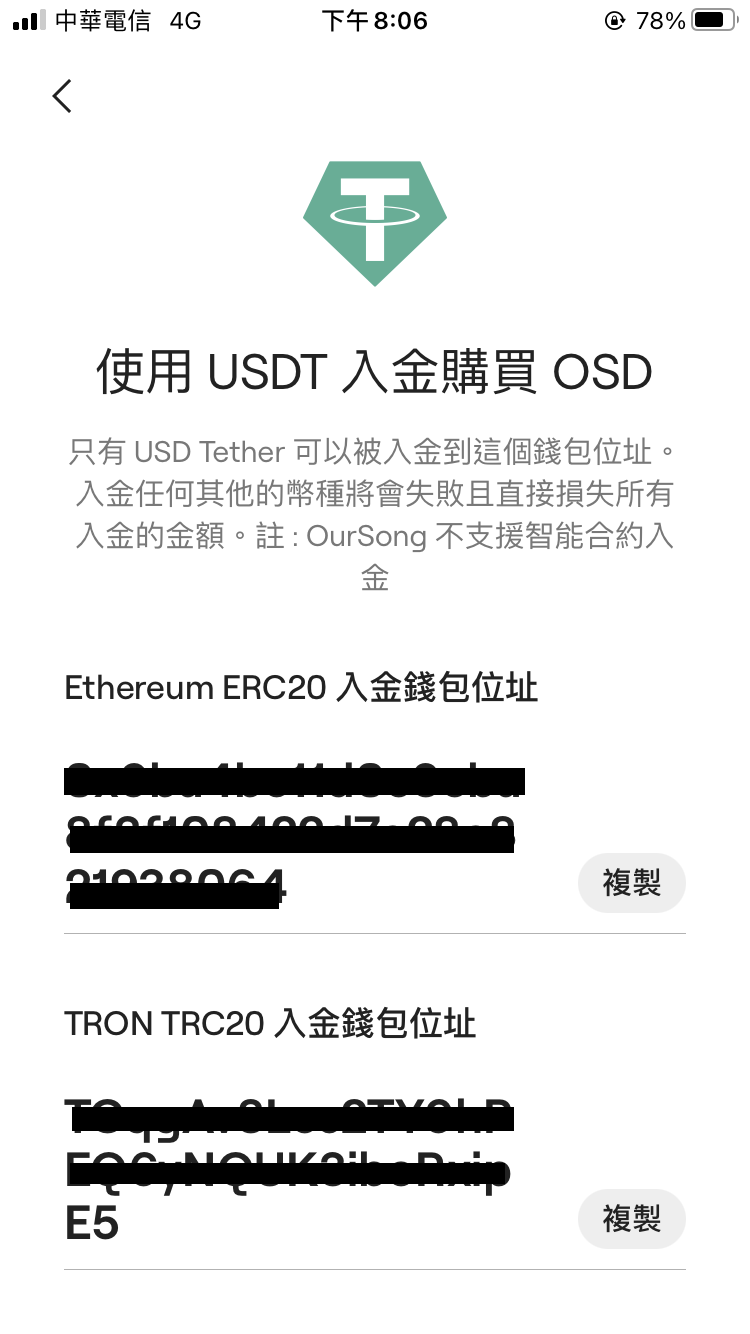 鏈有兩種,有TRC20和ERC20,TRC20目前都是免手續費,ERC20是要收手續費的,所以回到剛剛上面的Oursong錢包地址,請選用TRC20當作錢包地址吧!