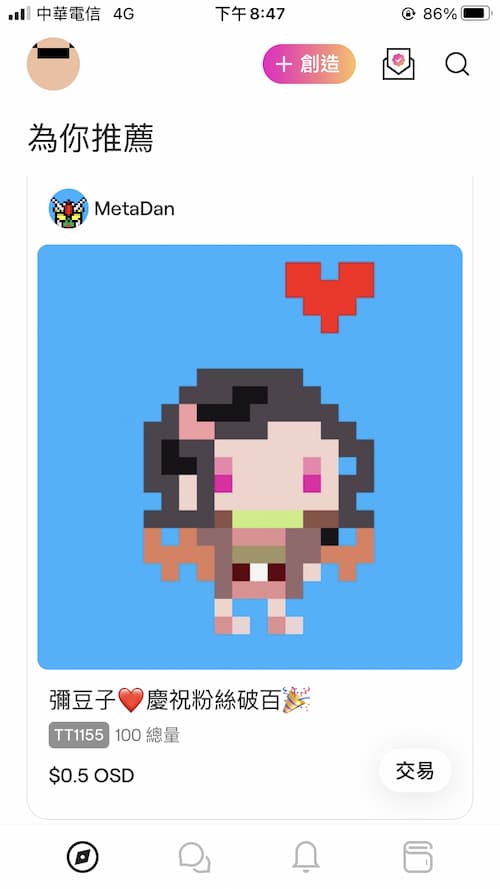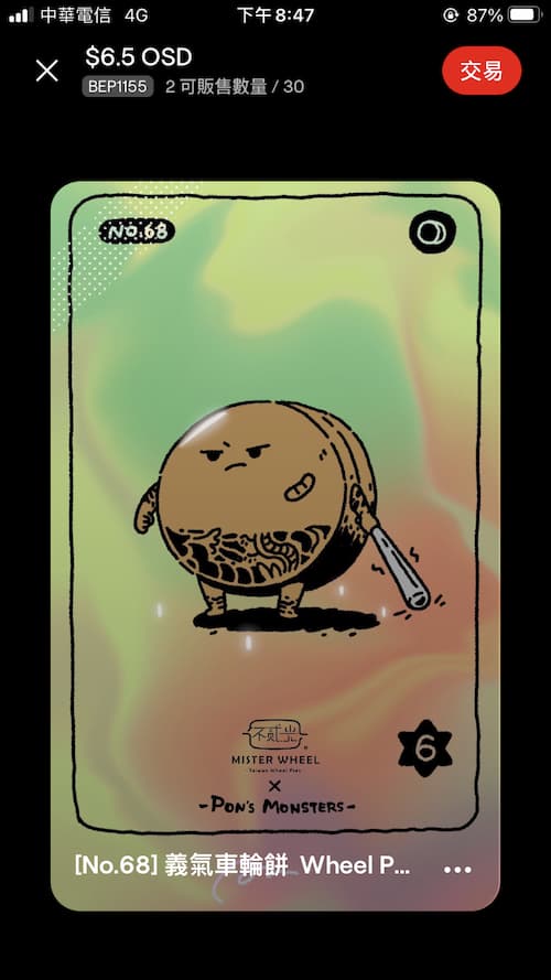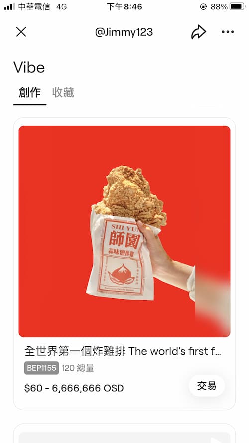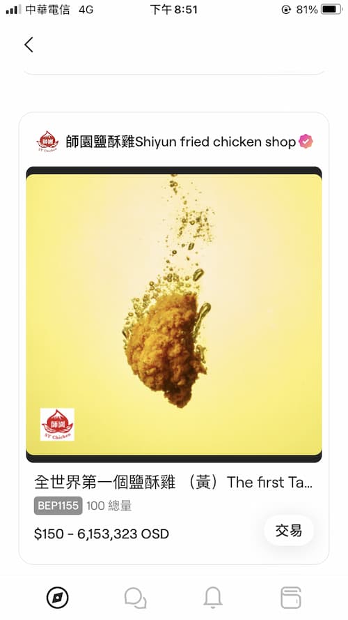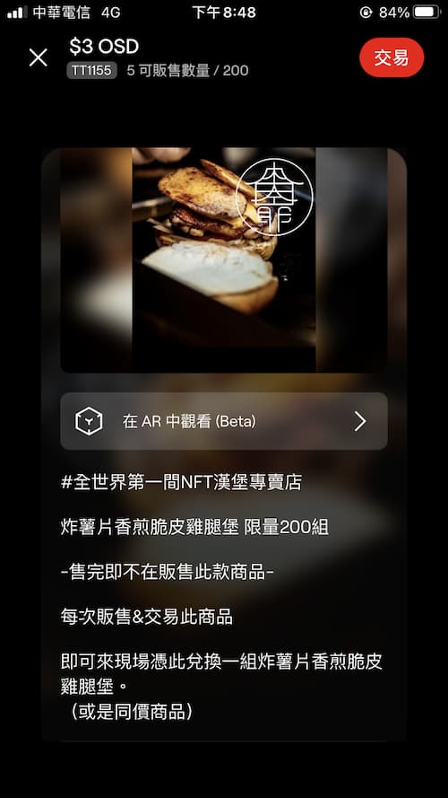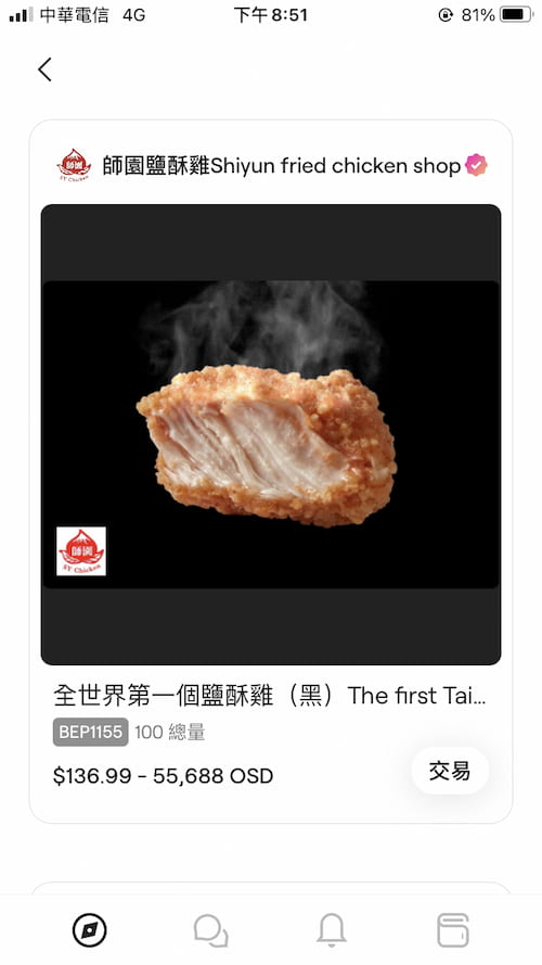 有些食物類的NFT很特別,發行的店家會在卡片說明欄說明,只要憑此張NFT的交易紀錄就可以去該店換取一份免費的食物,這點我覺得很棒!