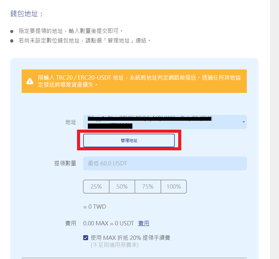 按下提領後會跳出輸出錢包地址,這裡建議是,可以先提最小金額來做測試,並且儲存地址,以後只要從選單選地址就好。