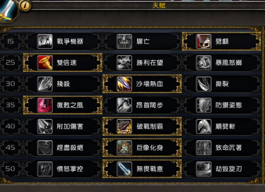 悶燃慣性:衝鋒和英勇躍擊可使你造成傷害提高200%,持續4秒。(通常打完第6層或第12層會出,優先選擇)