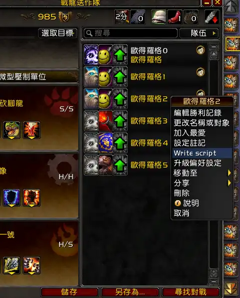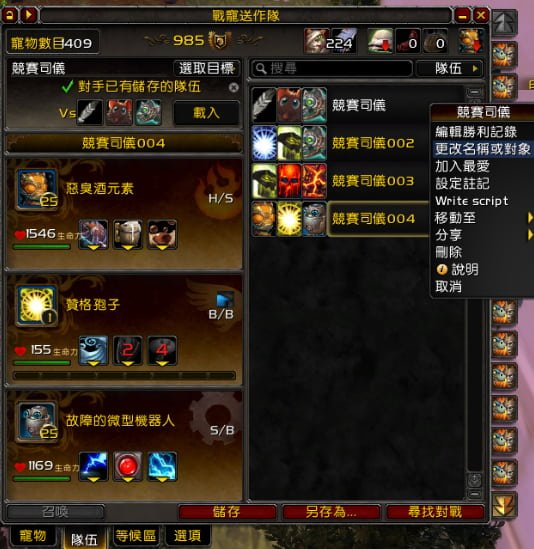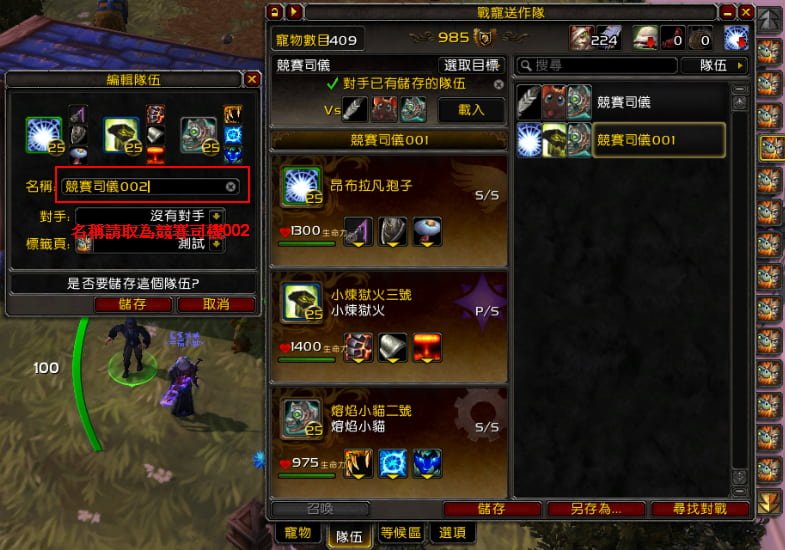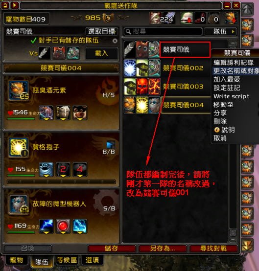 當目標是該NPC時自動換隊,再加上滾輪往上是移動到該NPC、滾輪往下是跟NPC對話及治療寵物、滾輪往下也是執行腳本。這樣就可以做到滾滾滑鼠滾輪,就自動對戰成功了,而且還會自己放治療寵物技能,可以縮小魔獸畫面去做其他事。