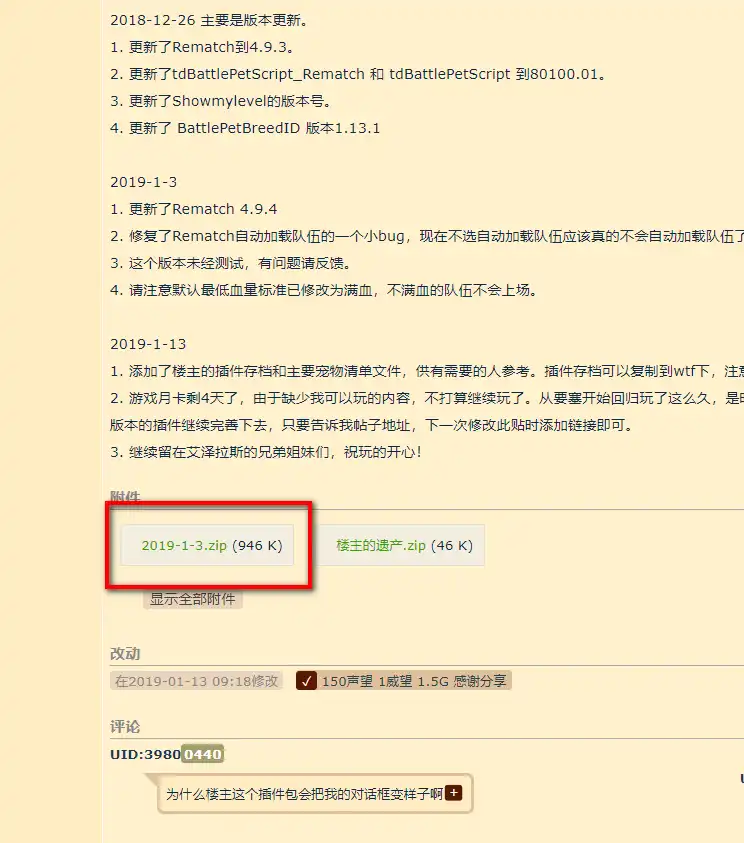 2.先到NGA[楼主疯了] 8.1可用的自动换队宠物对战插件,完美版。 的文章往下拉到樓主的帖子尾端,目前最新的版本是2019-1-3.zip這個