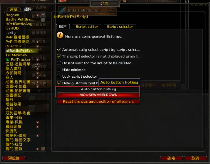 (B.)ESC →介面→插件→找到tdBattlePetScript→綜合分頁→Auto button hotkey設定滑鼠滾輪往下
