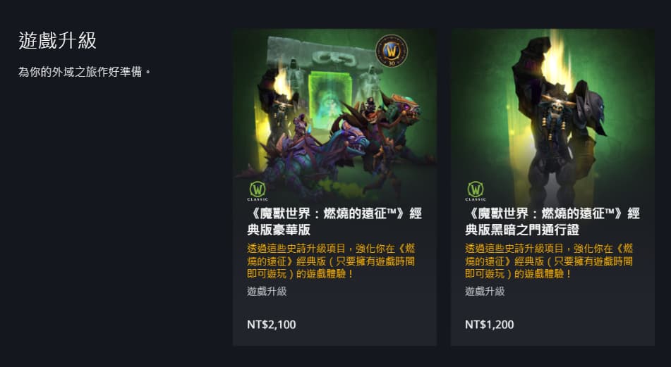 2100元-豪華版,內容有:直升一隻角色到58等、學會初級騎術(60%)、給基本裝、坐騎、起始一些錢、武器技能、30天遊戲時間、一個特別坐騎(正式版也有)、一個玩具、黑暗之門爐石。