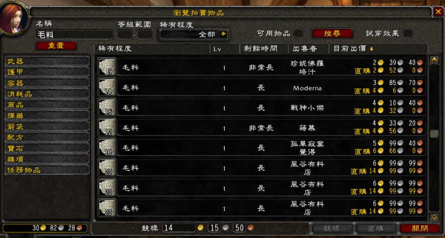 以5/29查看AH販賣的東西:亞麻布一組價格大概1G、毛料7G、絲綢0.7G、魔紋布18G、符文布5G。