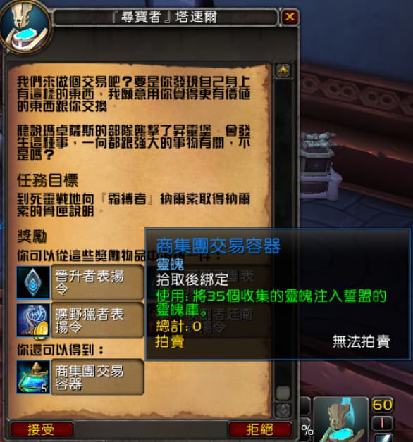 在奧睿博司旅店下一個樓層,有塔商集團NPC會給兩個5人副本任務,獎勵是個給5個35靈魄並自己選一個聲望提升。