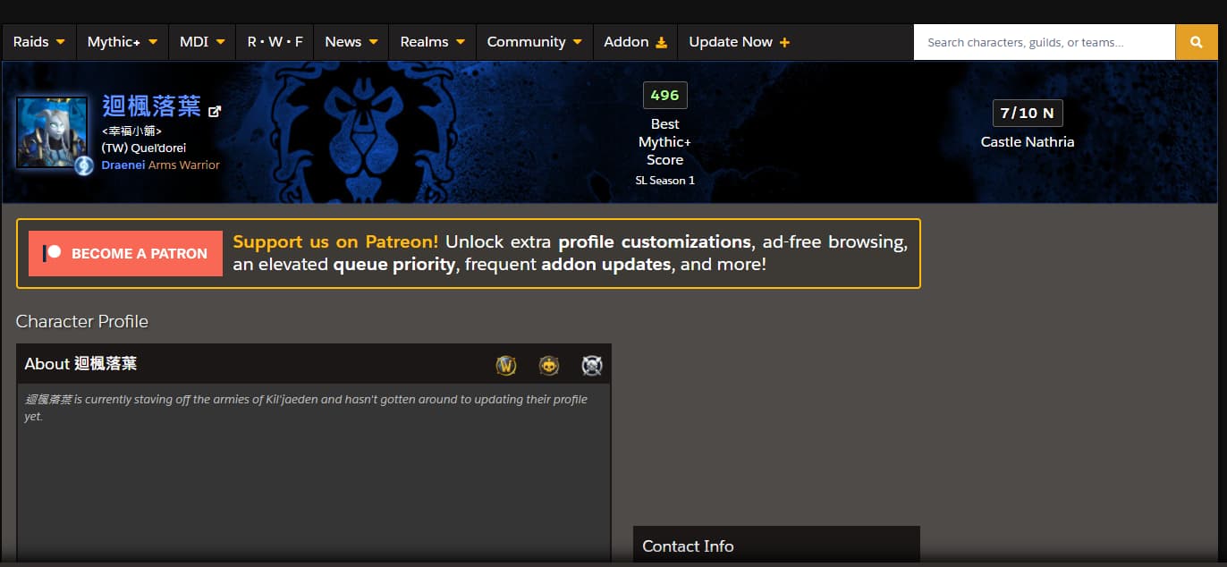 這裡只要在搜尋欄位搜尋自己的ID就可以看到角色,以及這一季的M+分數、團本進度,還有M+伺服器排名、世界排名...等,