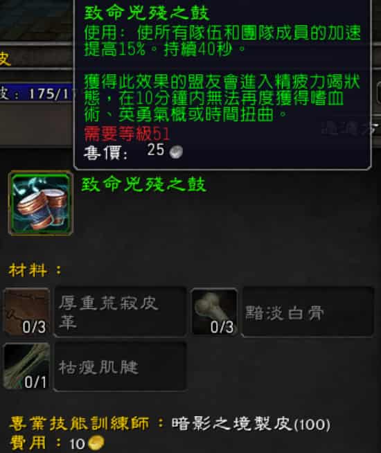 製皮原料來源是來自於從剝皮專業技能剝下野獸的皮,以往製皮的重要度不高,唯一有看頭的是嗜血鼓,雖說以前的版本嗜血鼓提供的加速是25%,但暗影之境版本的鼓已經降為15%了,原比薩滿、法師職業開的嗜血加速30%低太多了。