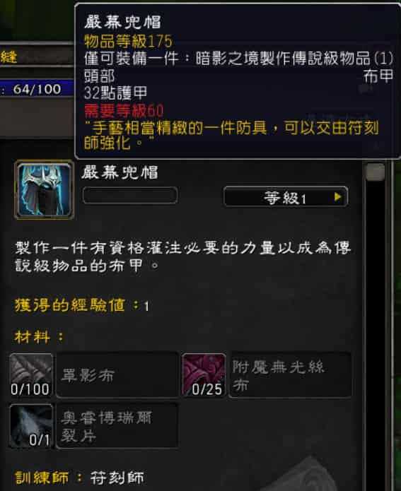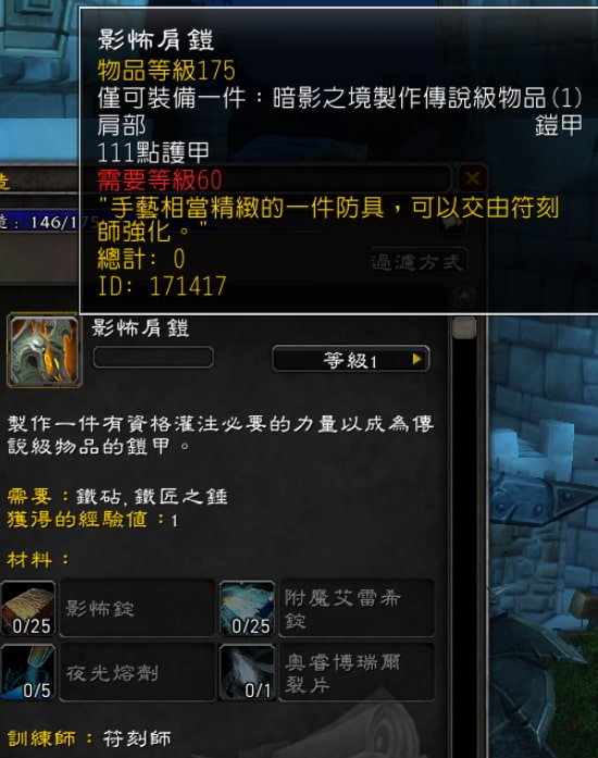 同樣地,在暗影之境版本,裁縫可以製作傳說級護甲,看似可以交易。