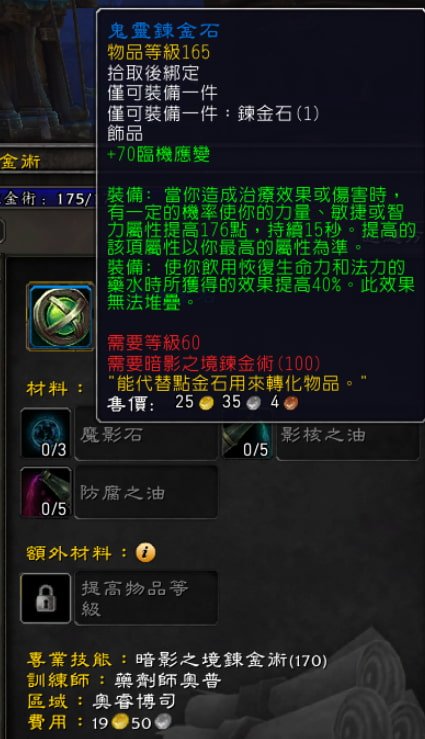 煉金術在初期版本有個好處是,有煉金石這個飾品可以製作來裝備,而且通常所需材料很少,且飾品能力很不錯。更重要的是,每個小改版都會再推出新的煉金石,又可以將原本裝等不高的飾品替換掉。