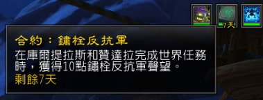 合約是完成世界任務時,會再多給一點點聲望點數,持續7天時間。之前拿給我小號吃,實測效果很令人傻眼,只多給10點聲望而已,10點聲望,真的沒有那麼誘人...。