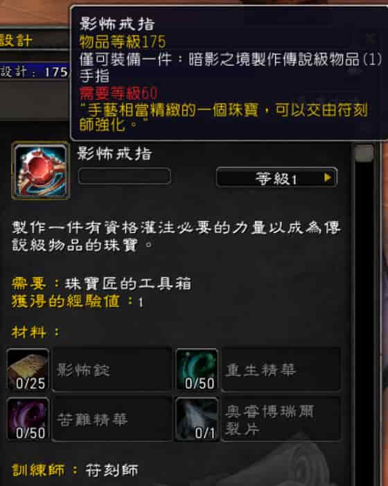 暗影之境版本新增了戒指與項鍊的傳說級製作裝備,看似可以交易,或許是個可以賺錢的管道之一。