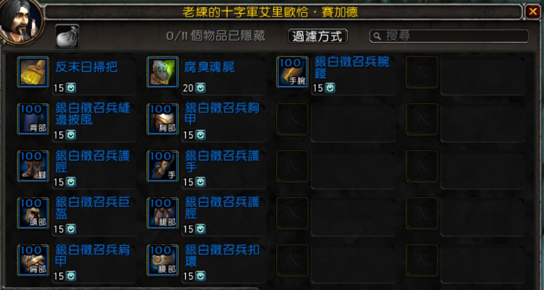裝備類和掃把每個都售價15個銀白十字軍表揚令