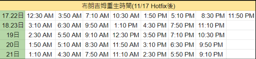 附圖是熱心的巴友提供的布朗吉姆重生時間。